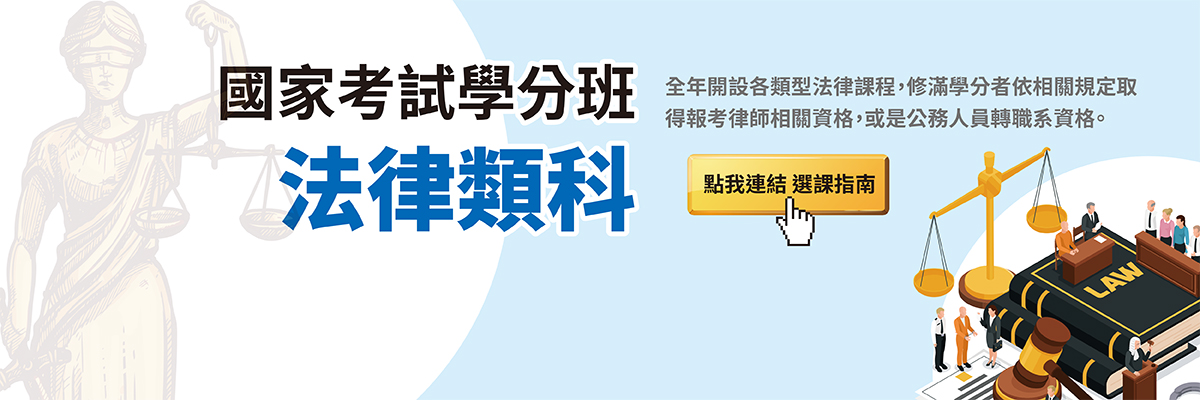 「法律類」開設課程:民法(3學分)、刑法(3學分)、行政法(3學分)、民事訴訟法(3學分)、刑事訴訟法(3學分)、商事法(3學分)、公平交易法(2學分)、證券交易法(3學分)、公司法(2學分)、租稅法(2學分)、智慧財產權法(2學分)、強制執行法(2學分)、著作權法(2學分)、商標法(2學分)、社會福利法(2學分)。