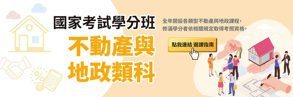 「不動產/地政類」開設課程(114年起調整,約每半年開設1門課程):信託法規(2學分)、土地登記實務(3學分)、土地利用法規(3學分)、不動產估價實務(3學分)。